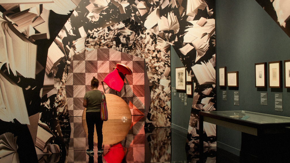 Per dissenyar l’escenografia, vaig reinterpretar els espais originals del llibre i, al mateix temps, vaig respectar els àmbits del guió expositiu de Kate Bailey, combinant ambdós imaginaris per crear un nou espai.