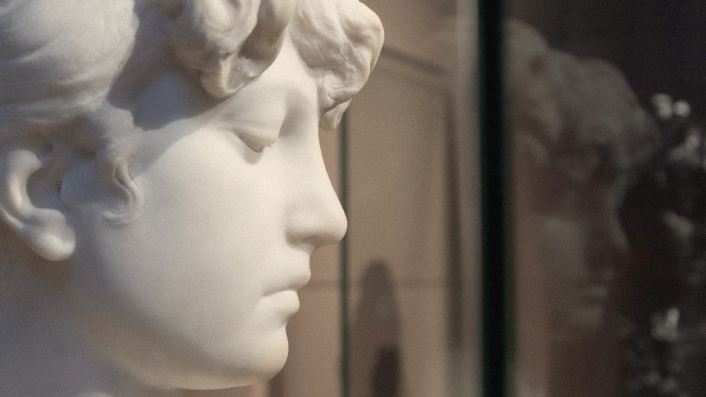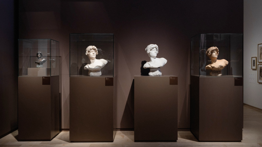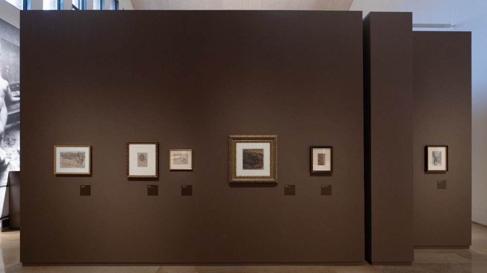 Al fons de la sala, una gran imatge del taller d’Agustí Querol, on projectava el fris de la Biblioteca Nacional de Madrid, serveix per contextualitzar la seva obra, escenificant l’espai creatiu de l’artista i aportant profunditat a la sala.