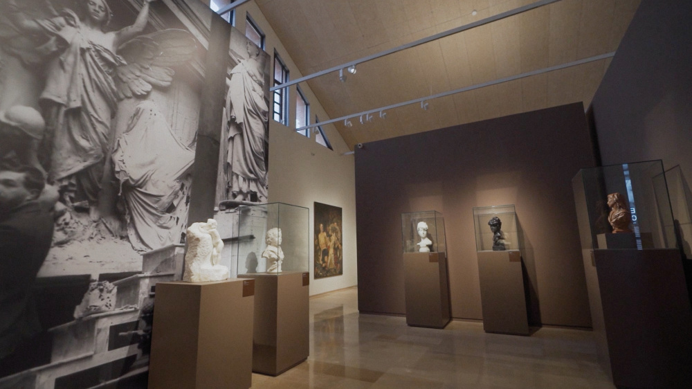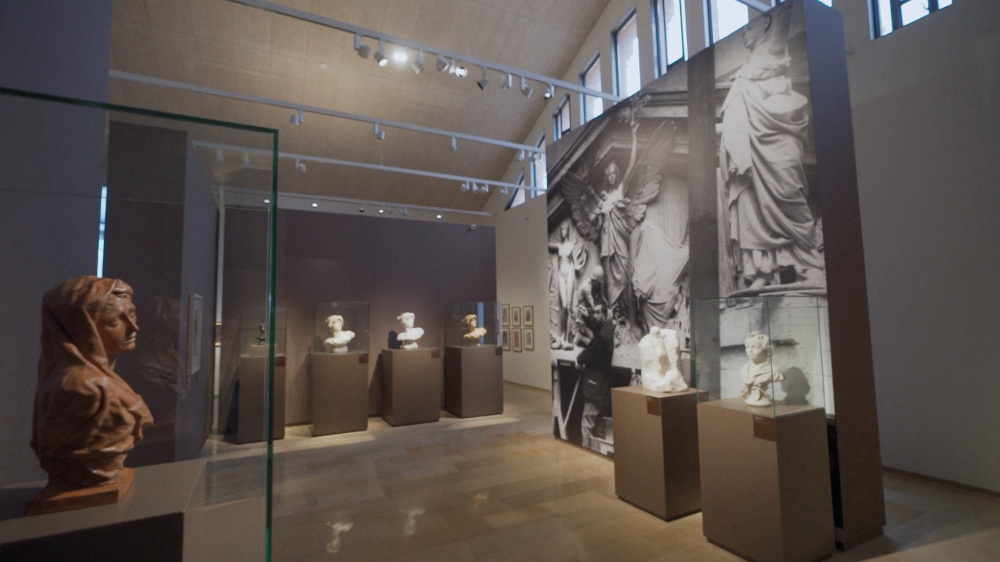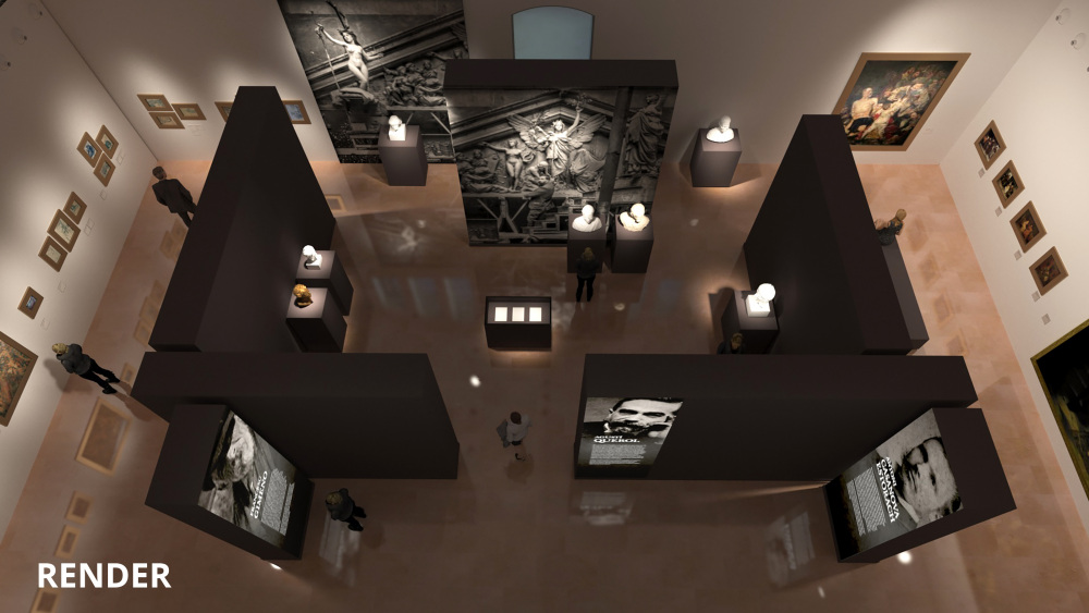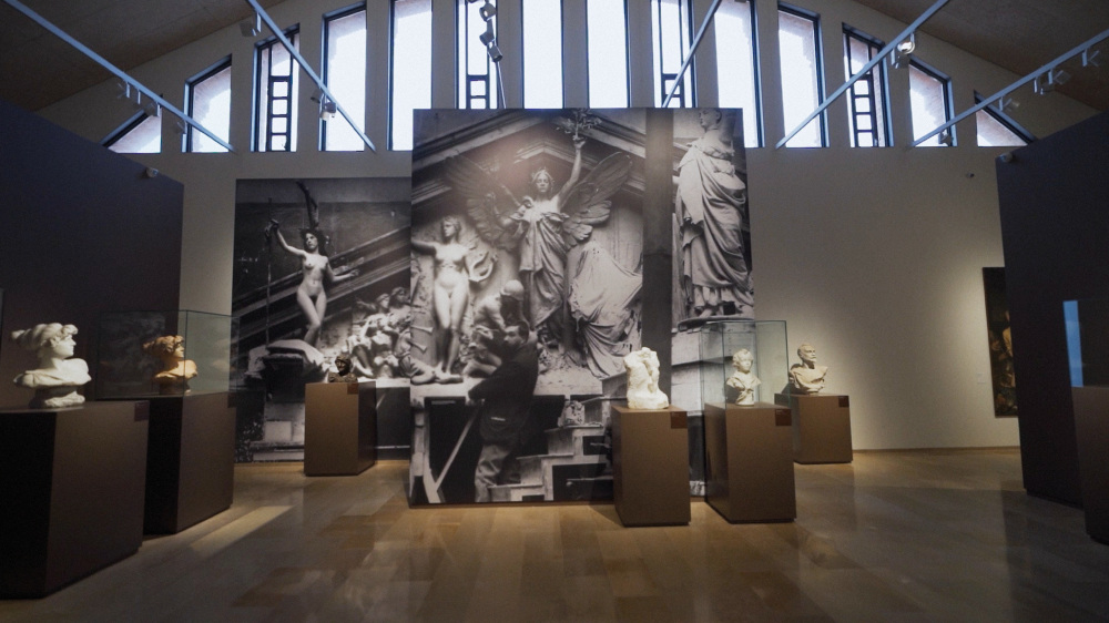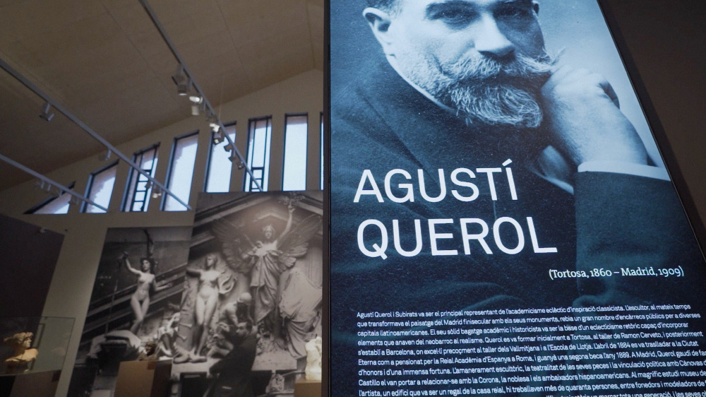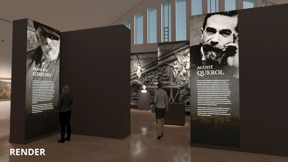 Al fons de l’espai, una reproducció de gran format del taller de Querol durant la creació de les escultures del frontó de la Biblioteca Nacional de Madrid actua com a reclam visual des de l’exterior de la sala.