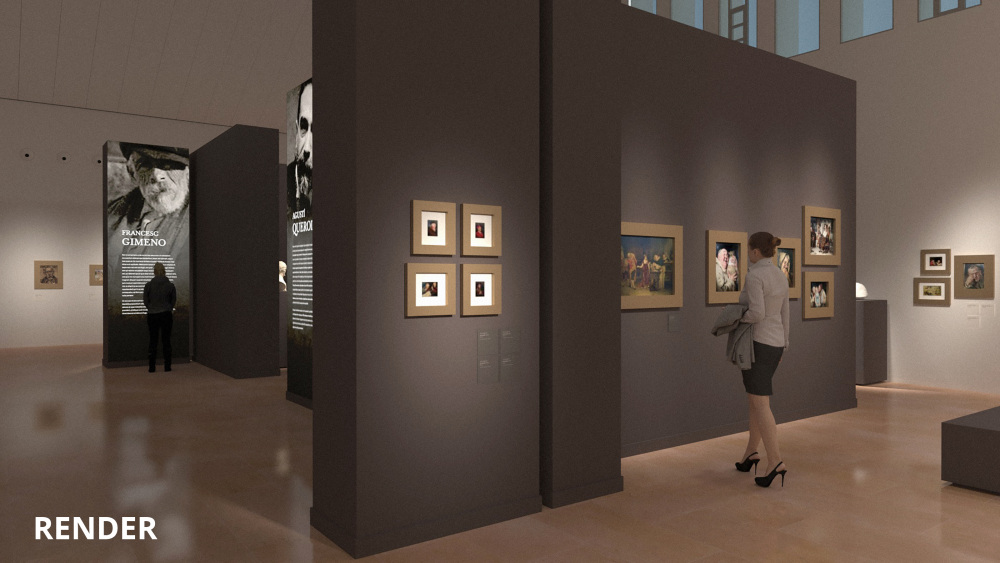 L’escenografia resultant posa en valor la singularitat de cadascun d’ells, donant-los protagonisme des del primer moment. A l’espai de rebuda, tres imatges imponents ens conviden a endinsar-nos en el seu univers: les mirades d’Antoni Casanova, Francesc Gimeno i Agustí Querol ens donen la benvinguda i ens introdueixen al gaudi de la visita.