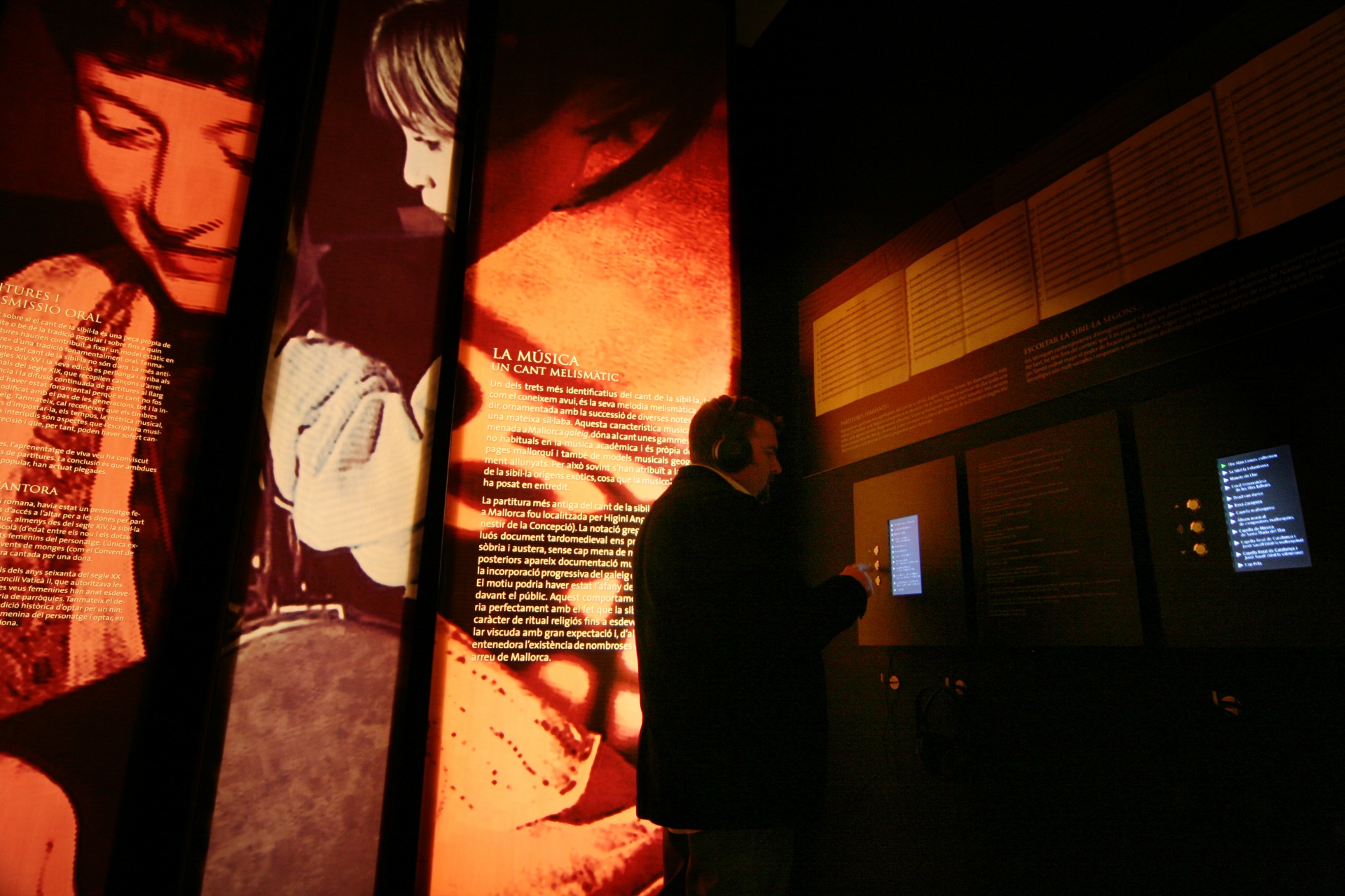 The Sibyl is a figure from pagan mythology adopted by Christianity around the end of the first millennium, as a predictor of the Apocalypse. This exhibition was designed to include very few pieces, since the performance of The Song of the Sibyl in Mallorca has been declared Intangible Cultural Heritage. There were very few images, and the existing video recordings were of poor quality. So we worked with some sculptures from an altarpiece, representations of the Sibyl, and the scarce audio-visual material. As a result, the tools for the resolution of this museography are again scenographic.