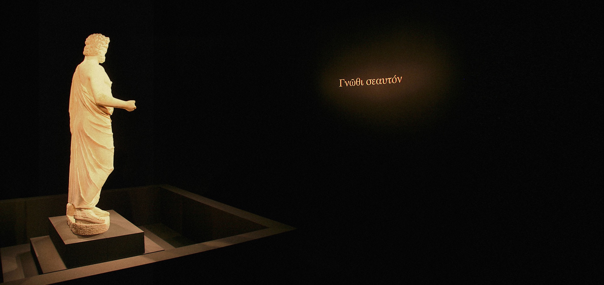 Para ello se divide la sala del Museu d’Arqueologia en cuatro partes: una introducción, un ámbito de inmersión, un ámbito de descubrimiento y un epílogo de profundización. En la entrada encontramos un espacio de recibimiento con una estrecha ventana a modo de grieta en la pared que nos permite aventurar ligeramente aquello que después descubriremos. Las salas están diseñadas en tonos oscuros, para que las piezas destaquen, acompañadas de cajas y grietas de luz que señalan los recorridos, donde se muestran las imágenes de la restauración, como si formasen parte del mobiliario de un laboratorio. Al final de este recorrido se encuentra la puerta de acceso al templo, un espacio circular de color negro intenso, completamente vacío salvo por la estatua iluminada del dios griego, un espacio de contemplación y espiritualidad, y de conexión con nuestro pasado. La entrada al mismo queda marcada por otra caja iluminada con la silueta del escaneo en 3D que se efectuó de la pieza. Comprendemos entonces que el dios estaba de espaldas a la entrada, posición que solían ocupar estas imágenes religiosas en los templos griegos, de manera que era el sacerdote quien tenía que moverse y postrarse ante el dios. Este acto es el que recrea nuestra escenografía.
